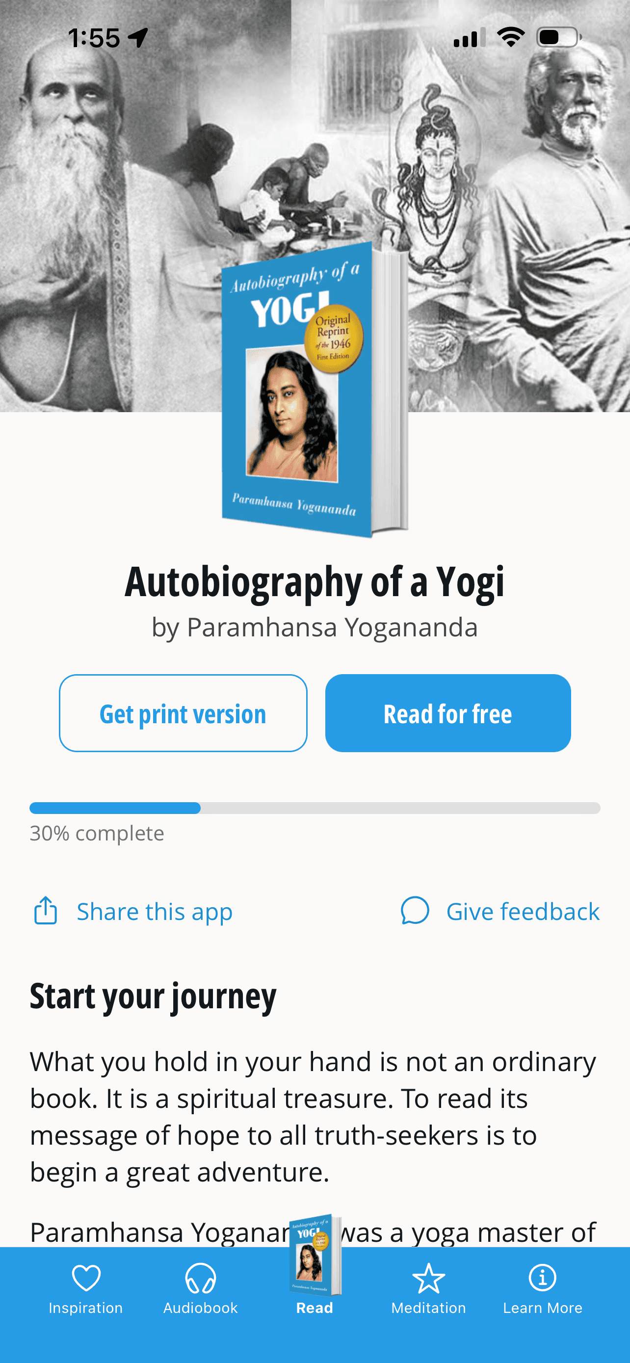This app is designed to share freely the entire work in its original edition, as an ebook and an audiobook. It also has resources to aid in a deeper study of the book and gateways to learn more about meditation and Ananda.